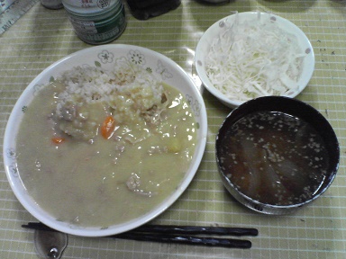 今日はシチューなどを頂きます。チーズ入りシチュー、御飯にかけて頂きます。汁物は玉葱と鶏挽肉のスープ、キャベツサラダも頂きます。今日もおいしく頂きました。