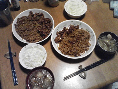 今日は焼そばなどを頂きます。ソース焼きそば・・汁物はミックス野菜と鶏団子のスープ、キャベツサラダも頂きます。今日もおいしく頂きました。