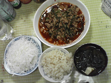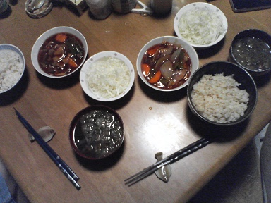今日は麻婆茄子などを頂きます。市販の素で作った麻婆茄子・・汁物はソーセージとモヤシとキャベツのスープ、キャベツサラダも頂きます。今日もおいしく頂きました。