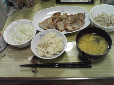 今日は豚肉などを頂きます。オリーブ油で焼いた豚肉、モヤシ炒めも頂きます。卵スープ・・キャベツサラダも頂きます。今日もおいしく頂きました。
