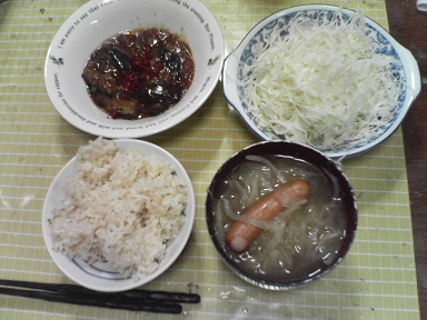 今日はカツオなどを頂きます。タタキ用のカツオを多めのオリーブ油で焼いてガーリックや醤油で味付けしたもの、汁物は麺つゆではんぺんを煮たもの・・キャベツサラダも頂きます。今日もおいしく頂きました。