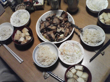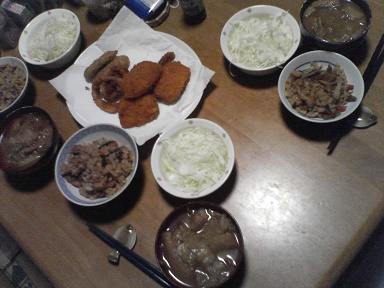 今日は揚物などを頂きます。あり合わせの揚物、コロッケなど?今日は炊き込み御飯・・味噌汁は旋回のキャベツ汁を流用、キャベツサラダも頂きます。今日もおいしく頂きました。