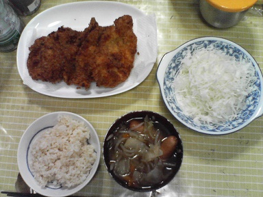 今日はカツなどを頂きます。トンカツ・・汁物はミックス野菜とソーセージのスープ、キャベツサラダも頂きます。今日もおいしく頂きました。