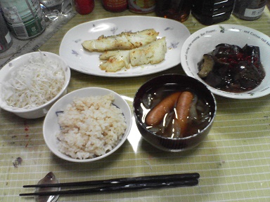 今日は鱈などを頂きます。鱈の香味焼・・茄子炒めも頂きます。汁物はミックス野菜とソーセージのスープ、キャベツサラダも頂きます。今日もおいしく頂きました。