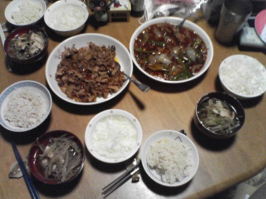 今日は豚肉などを頂きます。豚肉とシメジと玉葱などを炒め、甘口の焼き肉のタレで味付けしたもの、酢豚らしきもの?汁物は鶏肉とモヤシのスープ、キャベツサラダも頂きます。今日もおいしく頂きました。