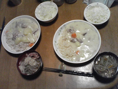 今日はシチューなどを頂きます。前回のシチューを流用、丼で頂きます。漬物も頂きます。汁物は前回のスープのアレンジ品、キャベツサラダも頂きます。今日もおいしく頂きました。