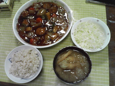 今日は酢豚などを頂きます。市販の素で作った酢豚、味噌汁はキャベツとあぶらげ、キャベツサラダも頂きます。今日もおいしく頂きました。