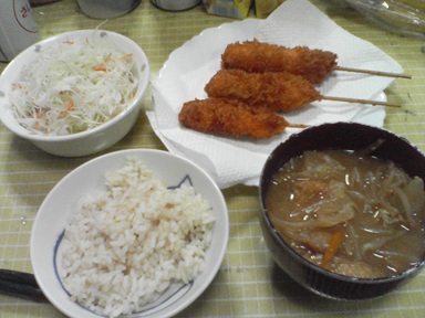今日は串カツなどを頂きます。市販の串カツ・・汁物は前回の味噌汁を流用、キャベツサラダも頂きます。今日もおいしく頂きました。