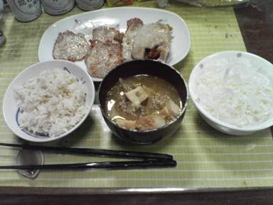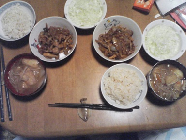 今日は豚肉などを頂きます。生姜焼き用の豚肉・・汁物は前回の汁を流用、キャベツサラダも頂きます。今日もおいしく頂きました。