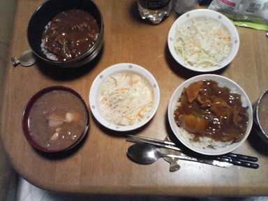 今日はカレーなどを頂きます。カレー丼、汁物は豚汁風の味噌汁、キャベツサラダも頂きます。今日もおいしく頂きました。