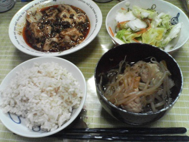 今日は麻婆豆腐などを頂きます。四川風の麻婆豆腐、汁物は前回のスープのアレンジ品、キャベツサラダも頂きます。今日もおいしく頂きました。