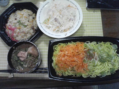 今日は焼きそばなどを頂きます。出来合いのネギ焼きそば?チャーハンも頂きます。出来合いのミニチャーハン・・汁物は前回の豚汁を流用、キャベツサラダも頂きます。今日もおいしく頂きました。