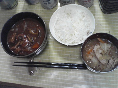 今日はカレーなどを頂きます。ポークカレー、汁物は前回の汁を流用、今日もおいしく頂きました。