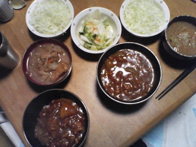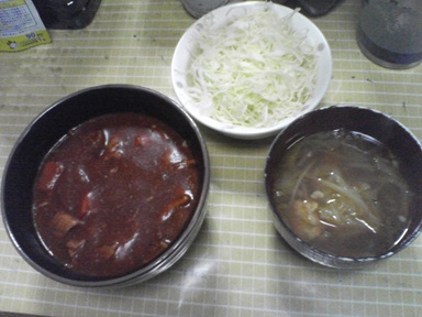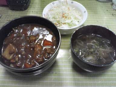 今日はカレーなどを頂きます。いつものカレー丼・・汁物は前回のスープのアレンジ品、キャベツサラダも頂きます。今日もおいしく頂きました。