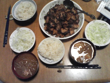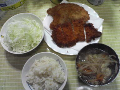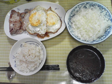 今日は豚肉などを頂きます。豚肉とついでに焼いた目玉焼き・・汁物は前回のスープを流用、キャベツサラダも頂きます。今日もおいしく頂きました。