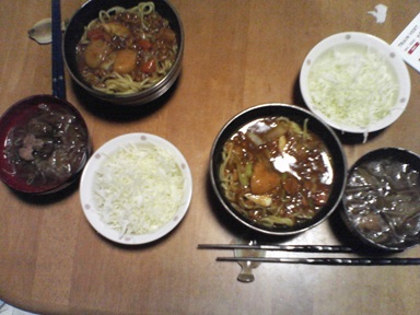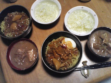今日はカレーラーメンなどを頂きます。温めた麺に前回からのカレーをかけて頂きます。汁物は前回の味噌汁を流用、キャベツサラダも頂きます。今日もおいしく頂きました。