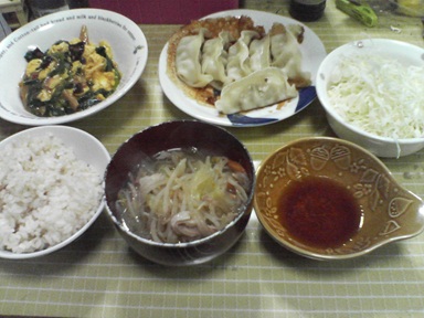 今日は餃子などを頂きます。市販の餃子、ニラ玉も頂きます。汁物は鶏皮とミックス野菜のスープ、キャベツサラダも頂きます。今日もおいしく頂きました。