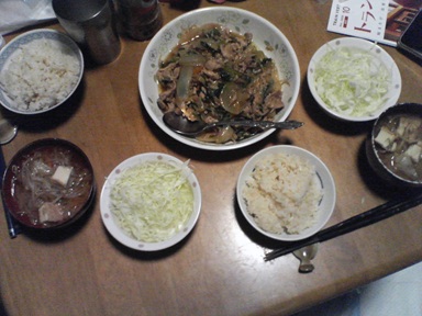 今日は炒め物などを頂きます。豚肉とミックス野菜とニラなどを炒め、中華ダシと醤油などで味付けしたもの、汁物はミックス野菜と揚げ豆腐の味噌汁、キャベツサラダも頂きます。今日もおいしく頂きました。
