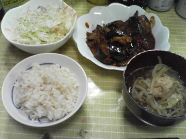 今日は茄子炒めなどを頂きます。茄子を炒め、市販の素で味付けしたもの、汁物は前回の鶏団子汁を流用、キャベツサラダも頂きます。今日もおいしく頂きました。