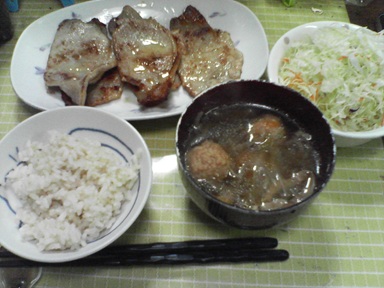 今日は豚肉などを頂きます。普通の豚肉?汁物はミックス野菜と鶏団子のスープ、キャベツサラダも頂きます。今日もおいしく頂きました。