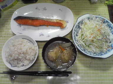 今日はシャケなどを頂きます。オリーブ油で焼いたシャケ、汁物は鶏団子とミックス野菜のスープ、キャベツサラダも頂きます。今日もおいしく頂きました。