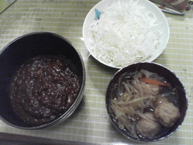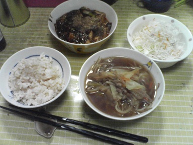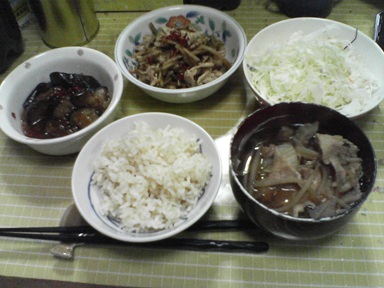 今日は茄子炒めなどを頂きます。茄子を炒め、市販の素で味付けしたもの、汁物は前回の鶏団子汁を流用、キャベツサラダも頂きます。今日もおいしく頂きました。