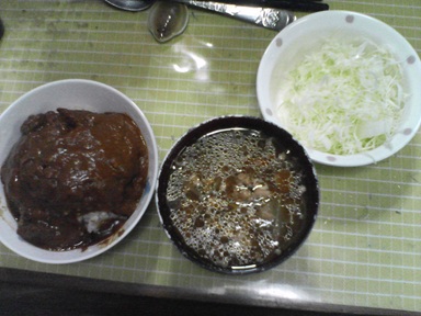 今日はカレーなどを頂きます。レトルトのカレー?汁物は前回のスープのアレンジ品、キャベツサラダも頂きます。今日もおいしく頂きました。