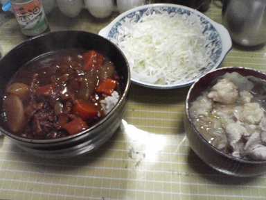 今日はカレーなどを頂きます。いつものカレー丼・・汁物は前回のスープのアレンジ品、キャベツサラダも頂きます。今日もおいしく頂きました。