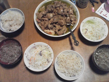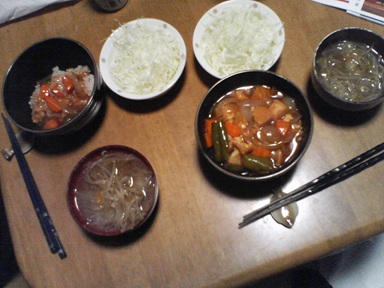 今日は炒め物などを頂きます。豚肉とゴボウの炒め物、ナス炒め・・汁物は豚肉とミックス野菜のスープ、キャベツサラダも頂きます。今日もおいしく頂きました。