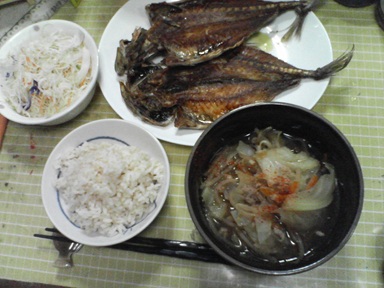 今日はカレイなどを頂きます。干物のカレイをオリーブ油で焼いたもの、汁物は前回の汁のアレンジ品、キャベツサラダも頂きます。今日もおいしく頂きました。