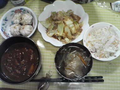 今日はキャベツ炒めなどを頂きます。キャベツと豚肉を炒め、市販の素で味付けしたもの、小籠包も頂きます。汁物はミックス野菜とワンタンのスープ、キャベツサラダも頂きます。今日もおいしく頂きました。