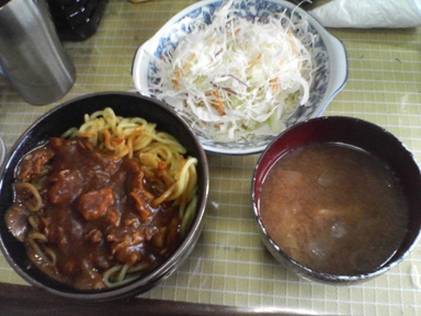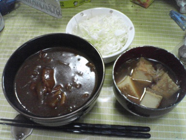 今日はカレーなどを頂きます。カレー丼・・味噌汁は茄子と油麩、キャベツサラダも頂きます。今日もおいしく頂きました。