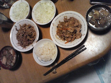 今日は豚肉などを頂きます。生姜焼き用の豚肉・・汁物は前回の汁を流用、キャベツサラダも頂きます。今日もおいしく頂きました。