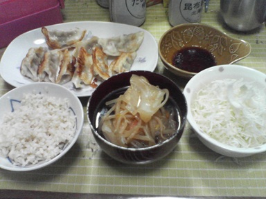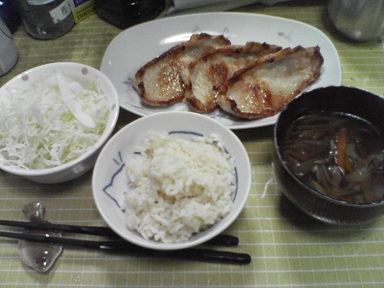 今日は餃子などを頂きます。普通の肉餃子、汁物は豚汁のアレンジ版?キャベツサラダも頂きます。今日もおいしく頂きました。