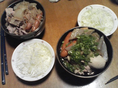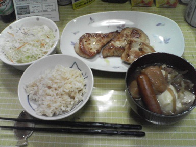 今日は豚肉などを頂きます。普通の豚肉?汁物は前回の豚汁を流用、キャベツサラダも頂きます。今日もおいしく頂きました。