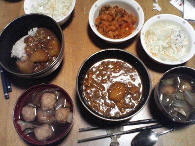 今日もカレーなどを頂きます。前回のカレーを流用、温めるときにかけ混ぜすぎてキーマカレーみたい?汁物はミックス野菜と鶏団子のスープ、キャベツサラダも頂きます。今日もおいしく頂きました。