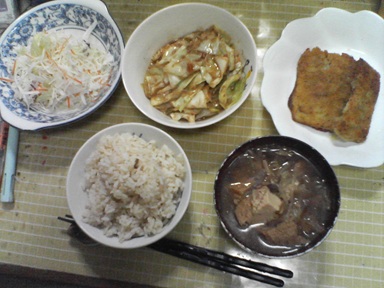 今日はキャベツ炒めなどを頂きます。キャベツを炒め、市販の素で味付けしたもの、白身魚の揚物も頂きます。汁物は前回のうどんの汁を流用、キャベツサラダも頂きます。今日もおいしく頂きました。