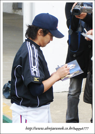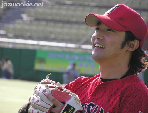 みなさん。昨日の、大地震、今日になって、報道で目にして、自然災害の恐ろしさを実感しました。偶然、ここに見える、zephyrさん。あんころさん。sukiさん。yukatonnさんには、大きな被害もなく、良かったなぁと思ってます。。ですが、ひどい災害を受けた方には、心から、お見舞い申し上げます。たまたま、金沢に、皆さんがいることもあって、余計にきになり、心配しました。御心配くださった方々、どうもありがとうございました。。でも、まだ、余震が続いています。十分気をつけて、お暮らしくださいね。。 さあ~~今日は、昨日の野球の写真が、またたくさん上がってます。。ねえ~~ジェウクさん。お髭が・・・・・これは、オフ それとも営業でどうでしょうね。でも、私は、ひげ好きで~~す。いいよ~~ワイルドジェウクさん。登場って感じ。。。いや~~髪もかなり長いですね。。先週とは、全く違うジェウクさんに、メロメロ 素敵。いい感じ。私は、かわゆい先週と違って、今週は。ドキドキするピョ~~~~~ンここで、mihakちゃんから、素敵なお話お聞きしましたよ。。。昨日の試合をご覧になった、お友達からのだそうです。ミスしたり、負けているときは~~あ~って感じだったけど・・・逆転した時、ファンに見た~~見た~~!って可愛い笑顔で、凄くうれしそ~~でした。帰り道でも、中継があれば~~中継があるときも頑張らなくては~とハニカム笑顔も素敵。寒かったので~寒くないと気にしてくれてやさしいです。フフ。。いや~いい話。ほんとに、野球好きなのね。。この場で、見た見たって。。可愛いお顔見たかったよ~~きっと、満面の笑みで・・・ほんとに、嬉しかったんだろうね。。なんて、自然なジェウクさん堪能できる。この野球は、いいよ~~価値あるね。。ね。ね。最後も、ファンに気を使って、寒くない??いや~~寒くても寒くないっていっちゃいそうだよ~~ も~素敵だね。。ありがとう。。mihakちゃん。こんな貴重な話聞けて、嬉しいです。。ウルウル。。あ~~なんでしょうね。このマスコット、きっと目を引いたんでしょうね。。お手製のようですが・・・・また、乙女の心、乱す、問題のマスコットなるのかなぁみなさ~~ん。ゴメンね。これは、atukoさん情報によると、、東急ハンズとこで売ってる、お守りみたいなもの。。らしいです。。心配しちゃったね。失礼しました。。