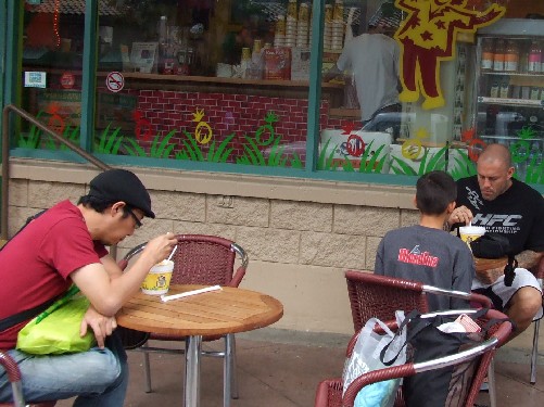 カイルアにいつも人が並んでるお店があるんですが・・・なんか皆さん丼みたいなの抱えこんで一心不乱にスプーンでかきこんでらっしゃる・・・・・・そんなの見たらどうにも気になるじゃないですか?そのお店とは「ラニカイ・ジュース」カイルアだけどラニカイ・ジュース。丼の正体はスムージー!なんでこんなデカイの?・・・食べてるだけの写真でスミマセン・・・スムージーの写真が無かった・・・(´o`;)実際はバナナとかイチゴとか果物がトッピングされてるからスムージーの量はそんなでも・・・な・・・くないかな・・・まぁ・・・2人くらいで食べたほうが無難な量(笑)・・・でも子供も一人で1個食べてるし・・・ちゃんとご飯も食べるんだよ。。。