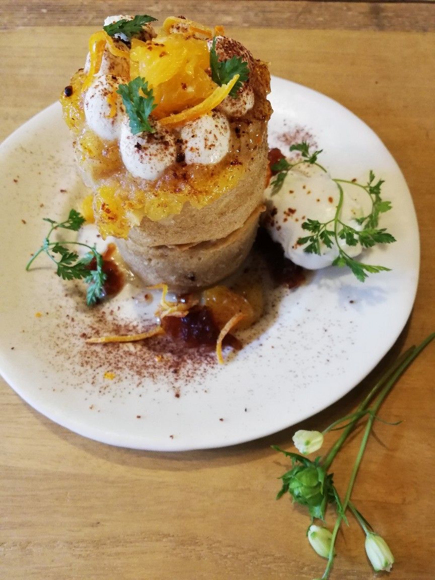 「伊予柑のティラミスパンケーキ」を頂きました。お店の中は広くないですが、お花の香りとドライフラワーや生花がキレイで雰囲気も最高素敵な空間で居心地いい まるで童話の物語に出てきそう