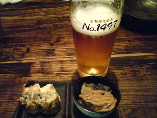 1/11 まだ京都についたばっかりのことを書いてます。もう見ている人は飽きちゃうでしょうけど(笑)私の記録でもあるのでお付き合いくださいませ。実は私たち、京都についてから東寺、西本願寺、四条のホテルまで全部歩いたんです。京都って碁盤の目?みたいにちゃんと道が出来ているので七条、六条、・・・と歩いているうちに着いてしまいました。さすがに疲れましたけどね(笑)ホテルで少し休んでから食事です。どこにしようか散々迷ったのですが夫が「いろいろ食べたい」というので居酒屋に決定。まさか関東にある居酒屋ってわけにもいかないので初めて行くお店にしました。ホテルから地下鉄の四条まで歩きつづけぱっとするお店が見つからないので道路反対側に周りホテルへ戻る道でまたお店を探しました。見た感じなかなか感じのいいお店を見つけましたぞ。チェーン店のようですが・・・「ほっとけや」さんです。旬・鮮・味 ほっとけや 室町店075-241-5778・・・うっ。ぐるなび見たらクーポンついてた・・・。調べてから行けば良かったデス。最初はビールで乾杯!お通しは牛すじをまぜた卵焼きだったんですけど大量のネギが入ってて夫に全部あげちゃいました・・。レンコンは食べました。ビールは京都限定の1497というものです。(キリンが出しているのですが酵母番号みたいなものかしら)これがなかなか美味いです。飲みやすいのでがぶがぶ飲んじゃいました。おぼろ豆腐、チキンステーキ、手羽先です。ブタの角煮、カキの味噌あんかけ(器も食べれます)これは「海老芋」というそうです。フシギな味でした。美味しかったです。お店の雰囲気も良かったですし店員さんも親切でした。帰るときは満席!おなかいっぱい、大満足でホテルへ戻ります。ホテルのすぐそばに「99円ショップ」を発見。でも全部が99円じゃないんですね。それに驚き(笑) →良かったらクリックお願いします♪「目指せ!幸せなお金持ち生活♪」トップページへ