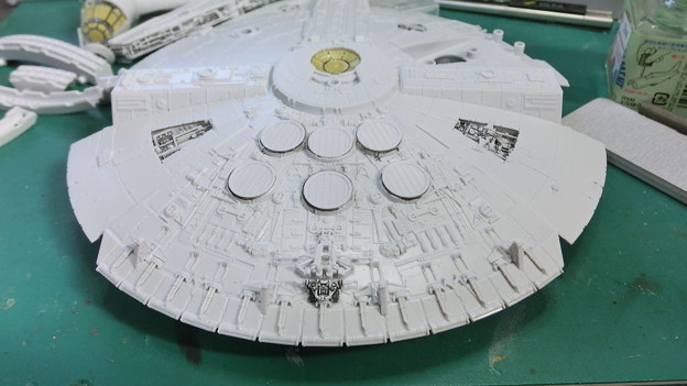 ミニアートの建物シリーズは、ようやく一棟(?)形になりました。まだ、部分的にパテ修正など必要かと思いますが、とりあえずは形になってほっとしています。このキットは、バキューム成形と言われる、プラパンを凸型に押し当てて成形しています。簡単に言えば、商品パッケージのブリスターパックみたいな感じで、余白を切り取ってパーツとするわけですけど、パーツと余白の境目が曖昧なのと、綺麗に切っても互いのパーツがピッタしあうなどと言うことはなく、かなり強引に接着する必要があります。接着後にパテでもなんでもつかって、形を出していくって感じですね。バンダイのミレミアムファルコンです。とにかくモールドが細かいです、これはこれでプラモデルと言うよりパズルみたいな感じですね。いい感じで形になってきました。クリアーパーツはマスキングしてはめ込みます。ほぼ、本体のパーツは形になりました。しかし、やはりミレミアムファルコンとなると・・電飾したいよね・・ ☆楽天市場☆ 特価プラモデル一覧リスト プラモ製作に役立つ動画公開中 ●おいさまのプラモチャンネル(プラモデル製作に関する動画を公開しています。) ●過去作品ギャラリー(今まで製作したプラモデルの画像ライブラリー) ●プラモ屋さん.com(プラモデル製作代行サイト)