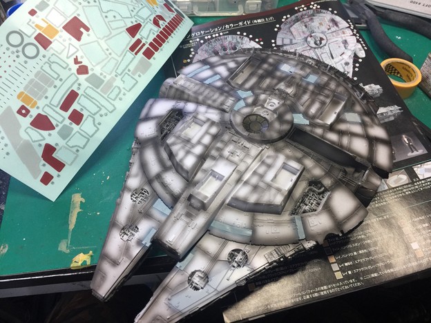 バンダイ1/144ミレニアムファルコンの製作パネルの色違い部分は塗装を行い、付属のシールをマスキングシート代わりに使用します。シールとデカール両方をセットしてくれてあるので、こういう全塗装の時も非常に役に立ってありがたいですね。ひたすら、各パネルを塗装してはマスキングを繰り返し、ついに本体色を塗装しました。乾燥後にマスキングをはがすとこんな感じになります。ぬりっぱなしだと、ぼやっとした感じなので、ここから引き締めていきます。その前に存在に気がついていなかったBB-8を塗装しました。尋常ないほど疲れました・・・小さすぎるスミ入れを行い、全体にうすら汚れというかエイジング処理をおこないました。これでぱりっとした感じになったので、明日には仕上げのウエザリングを行って行きます。 ☆楽天市場☆ 特価プラモデル一覧リスト プラモ製作に役立つ動画公開中 ●おいさまのプラモチャンネル(プラモデル製作に関する動画を公開しています。) ●過去作品ギャラリー(今まで製作したプラモデルの画像ライブラリー) ●プラモ屋さん.com(プラモデル製作代行サイト)