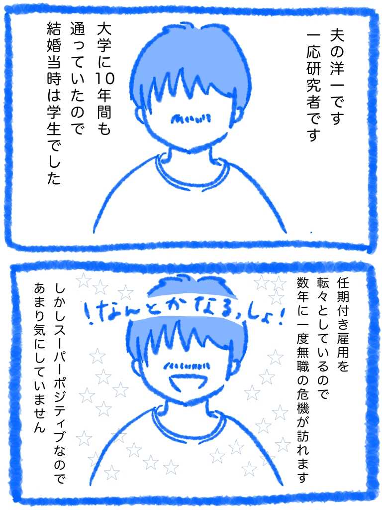 今日は家族紹介。まずは夫の洋一です。職業は研究者です。まだまだ若手なので任期雇用で色々な大学を転々としています。なかなか不安定な日々ですが本人はあまり気にしていないようです笑同じ大学の同級生として付き合い始め、十数年を隣で見てきたのでこれから研究者として生計を立てたい方の参考になるような記事も描いていきたいと思います。