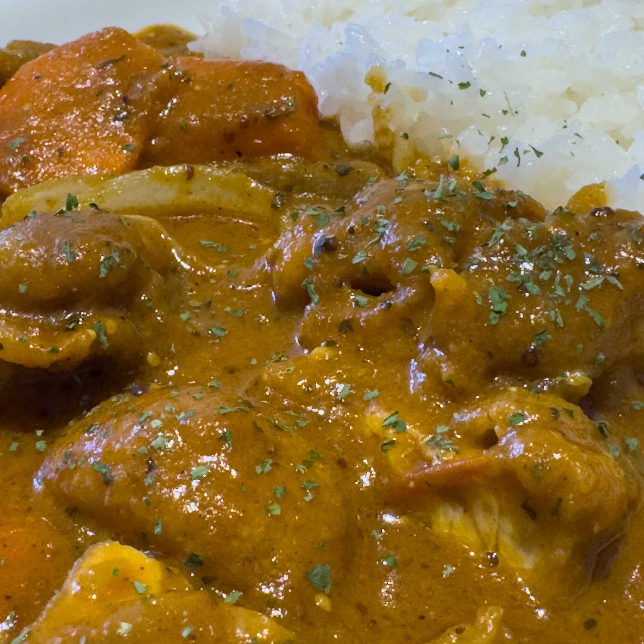 チキンがごろごろたくさん入っています。その他、玉ねぎ、にんじん、じゃがいも。お家カレーでお馴染みの具でこれぞカレーって感じの具がいっぱい入っています。
