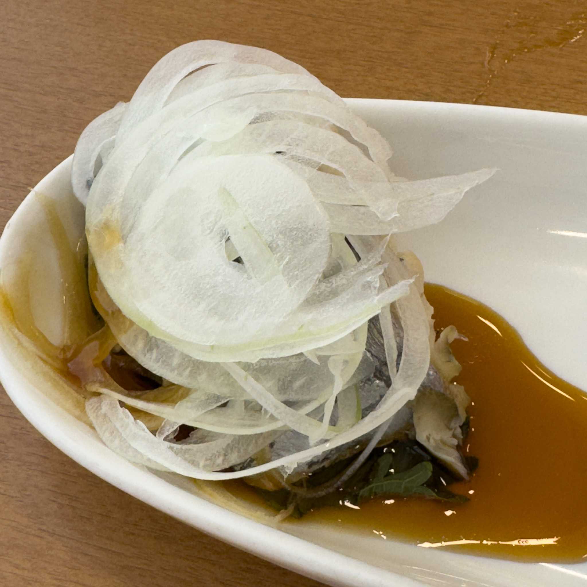 鯖の照り焼きソース大葉玉ねぎスライス。