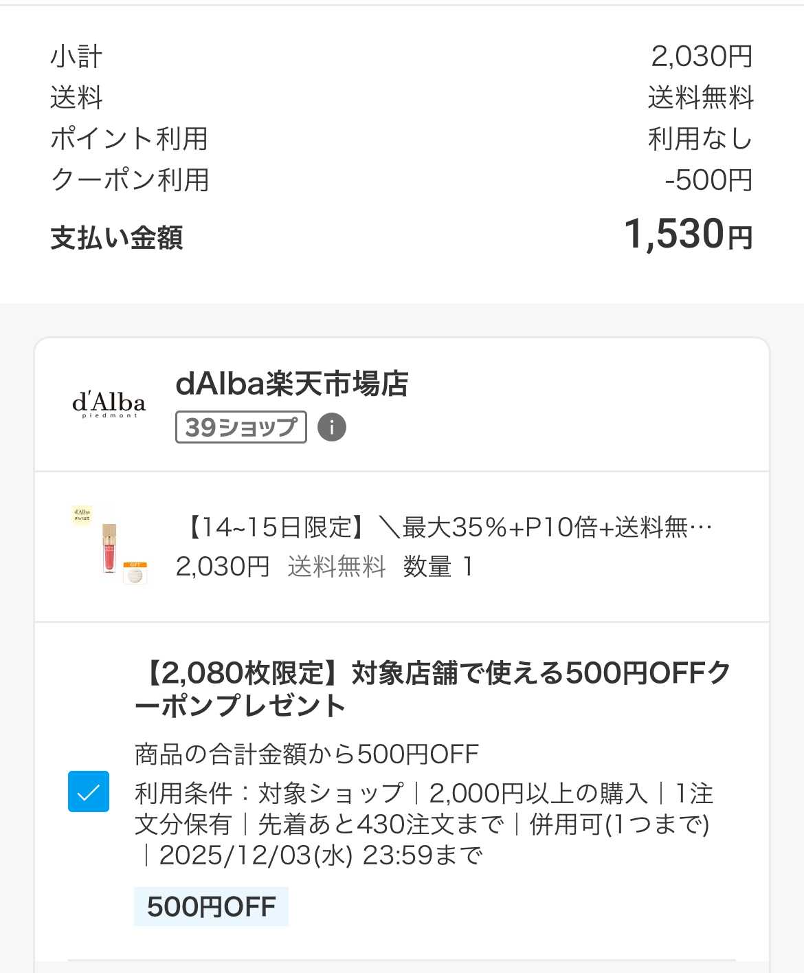 おはようございますー今日は市場の日ですね。買い回りする程買わないーという方は今日がお勧めです😊#当ブログはアフィエイト広告を利用しています。10月1回目のマラソン分到着レポです!10/17に届いたのがSKIN1004 OFFICIALさんとダルバさん。①スタダ50%オフクーポンポチ分のSKIN1004 OFFICIALさん発送はいちばん早かったけれど到着は8日程掛かりましたー【mireコラボ★20%クーポン+P10倍】秋の肌ケア2種セット\送料無料・ギフ...価格:5,500円~(税込、送料別) (2025/10/9時点)【オギャ子コラボ★20%クーポン】ありのままをもっと好きに!自分磨きを楽しむルー...価格:6,200円(税込、送料別) (2025/10/9時点)最初のセットは毛穴ケアにしましたヘアバンドおまけで付いてきました♡②スタダ50%オフと25%オフクーポン併用できたので75%オフ+P20倍で買ったマスク。実質1枚20円ちょっとになりました😊めっちゃ大量♡こちらのマスクはしっとりしているので後のケアが面倒な時によく使います。通常:トナパ⇒リードル(導入液)⇒マスク⇒セラム⇒クリーム、ですがこちらのマスクはトナパ⇒リードル⇒マスク⇒終了!という使い方もできます。朝時間のない時も便利です。【P20倍×クーポンで25%OFF】ROOM コラボ KISO CARE 高濃度...価格:2,770円~(税込、送料無料) (2025/10/9時点)×3セットシートの形状、使い心地と言い、しっとりさといい、香りといいお気に入りなマスクなのだけど、シートの間にプラシートが挟んであるのが環境的にむむ…と思います。(ゴミ的にも)ただシートが柔らかすぎて形が保てないのだろうなとも思うので何か改善あればいいな。③ケーキリンクさん、半額からメルマガ登録500円オフクーポン使用【50%OFF】【10/13までのお届け】アンリシャルパンティエ 誕生日 ケーキ...価格:2,599円(税込、送料無料) (2025/10/9時点)予想よりミニマムで手のひらよりちょっと大きいサイズくらい?3人家族にちょうど良いサイズでした😊④メディテラピーさんのサンキュー40%オフクーポンでレチナール10/15に到着しました!早速夜に使っていきたいと思います!【大容量150ml】レチナールスキンブースターセラム 美容液 導入液 導入美容液...価格:2,700円(税込、送料無料) (2025/10/9時点)⑤ダルバさんでリップとハンドクリームのセット箱が大きいなと思ったら紙袋がついていました♡\2,000円~ポッキリ+送料無料/クーポンで32%OFF★+P10%還元!【新発売!ギフトセット/ハンドクリームセット】【 d'Alba ( ダルバ ) 公式 】【 リップ ボリューマイザー 4色 】 プランピング リップグロス グロウ ムード ボリューマイザー プレミアム ゴールド チップ 唇韓コス20%オフクーポン使用+P10倍ハンドクリームいい香りだし使い心地も悪くないのだけど、チューブの出口が謎形状なのと立たないのが私的にはうーん。自分で使うなら良いのだけどプレゼントには向かないかな。←といいつつ3個買いました(笑)リップは使い心地良いし高級感があってテンションあがります🤗⑥VTさんで新製品の半額のPDRNリードルショットをポチ。10/16に到着しました!【新発売特価】\50%OFF+送料無料/【VT公式】【 PDRN リードル ショ...価格:1,760円(税込、送料無料) (2025/10/9時点)100円オフクーポン使いました。韓コスフェアは不参加で残念でした🥺➆楽天24さんで久しぶりの15%オフクーポンを使って日用品などまとめ買い。キュレル 潤浸保湿 入浴剤 つめかえ用(360ml*2コセット)【キュレル】価格:1,463円(税込、送料別) (2025/10/9時点)詳しくはポチ記事をご覧くださいー⑧NIKEで息子靴 60%オフ+P10倍でした 息子には体育館シューズって呼ばれてます🥺【期間限定価格 10.4 0:00〜10.9 1:59】ナイキ V5 RNR メ...価格:5,060円(税込、送料別) (2025/10/9時点)確かに。⑨コスムラさんで韓コス20%オフクーポン使ってポチ国内発送なのですぐに到着しました!レビュー良かったのでお試しです\20%OFFクーポン/ コスムラ 3GFエッセンス 100ml 30ml 美容...価格:2,970円~(税込、送料無料) (2025/10/9時点)こちらはぽちれぽしてなかったかも…小さいほうなのにマスク3枚おまけついていました😊保湿が少し物足りない時に使ってみます。⑩マラソンラスト4000円オフクーポンでオリヤンさん。10/14に到着しました!マラソンラストにポチしたのにいちばん早かったです😊★新登場!★ 【BRING GREEN】スーパーレモン グルタチオンアイクリーム...価格:2,450円(税込、送料別) (2025/10/9時点)詳しくはぽちれぽご覧くださいーオリヤンさん、マラソンのラストに併せてクーポンだしてくれるの優しい🥺⑪韓コス20%オフクーポンを使ってクリオさんのクレンジングバームポチ。10/16通関なのでそろそろ到着するかな?★NEW★バーム【GOODAL(グーダル)公式】グリーン タンジェリン ビタC ...価格:2,380円(税込、送料無料) (2025/10/9時点)クリオさんのコスメは信頼度が高いです。ハズレなし。次のスパセでセットになれば嬉しいなー。⑫110円でアウトレットマスクを大量ポチ。到着時撮るのを忘れてました。と、いうのも何も袋などに入らず、混合で大きな箱にガサッといれてあるだけだったのでびっくりし
