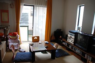ゴールデンウィークから少しづつ子供用に居間の改造をしてきたんですが・・・今日になって、ようやく完成しました!!これが以前の状態・・・船橋のIKEAに行ったりして棚を買ってきたり、床にワックスをかける為に部屋を片付けたり・・・一日は館林の芝桜を観にドライブに行ってきた以外はほとんど家で掃除と片付けの日々でした。多少の位置修正などもしたので・・・、結局今日になって完成しました。その結果はこんな感じでみんなお疲れモード・・・。子供がぶつかりそうなものは全て排除、角は保護して、手に届きそうなモノは上にあげてあります。手前の籐の丸い椅子でキッチンや玄関に行かないようにブロックする作戦です。写真でみると思ったより変わってないか?