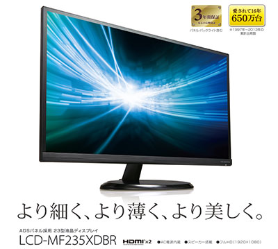 フレームレスパネル採用でより省スペースにブルーリダクション搭載 23型ワイド液晶ディスプレイすっきりスタイリッシュなフレームレスパネルを採用パネルの上部と左右にフレーム(枠)による段差がないフラットなフレームレスパネルを採用しました。上部のベゼル幅はわずか8.5mm、左右も約9.8mmの狭額縁タイプで、見た目もすっきり。スタイリッシュなデザインの液晶ディスプレイは、オフィスにも自室にもマッチします。また、当社従来品の23型液晶ディスプレイと比較して、約10%もコンパクトなボディを実現。21.5型モデルとほぼ同等のサイズ感で23型の画面をご利用いただけます。どこから見ても鮮やか!動きのある映像もクッキリ上下左右178°の広視野角なADS(Advanced super Dimension Switch)パネルを採用。見る位置や角度による色やコントラストの変化が少なく、どこから見ても映像を鮮明に映し出します。HDMI端子&スピーカーを標準搭載 AV機器やゲーム機との接続に便利なHDMI端子を2系統搭載しています。様々なゲーム機やハイビジョンレコーダー、ハイビジョンカメラ等と接続してお使いいただけます。また、スピーカー(1W+1W:ステレオ)を本体に搭載しているので、音声を楽しむこともできます。HDMIで接続すれば、HDMIケーブル1本で映像も音声も出力できます。※出力機器がHDMIでの音声出力に対応している必要があります。液晶ディスプレイ自体でブルーライトを低減させる「ブルーリダクション」搭載 パソコンで作業をする際に目の疲れの原因とされるブルーライト(青色光)。専用のメガネをかけたり、モニターにフィルターを貼ったりといった対策が一般的ですが、本商品はディスプレイ自体がブルーライトを低減させる機能「ブルーリダクション」を搭載しています。専用のメガネやフィルターを購入することなく、ディスプレイ本体でブルーライトを抑制して快適にお使いいただけます。※本機能を適用することで青色をカットすることになるため、画面が黄色がかって見えるようになります。メガネやフィルターと異なり、低減率を5段階で調節できます。デザインやWEBなど色味が気になる作業では強度を弱く、エクセルやワード文書などの編集作業では強度を強く設定するなど、作業内容に合わせて調整することが可能です。また、1台の液晶ディスプレイを複数名で利用するときも、利用者に合わせて調整できるので大変便利です。新製品 アイオーデータ LCD-MF235XDBR 23型ワイド液晶ディスプレイ フレームレスパネル採用価格:26,980円(税込、送料込)