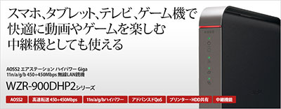 Windows8.1対応 無線LANルータ エアステーション ハイパワーGiga WZR-900DHP2 ◆5GHz&2.4GHzでたくさんの機器と同時につながるWZR-900DHP2 は11n/a450+11n/g/b450Mbpsの高速転送※に対応したハイパワータイプの無線LAN親機です。高速な通信が利用できるため、光回線等の高速回線速度をフルに活用してインターネット接続でのダウンロードや、大容量ファイルの転送、ハイビジョン映像の再生などをより快適にお使いいただけます。◆3ストリームのデュアルバンドでたくさんつなげても速度が落ちない無線LAN高速化規格11nは送信と受信を複数のアンテナで行うMIMO(Multiple Input Multiple Output)技術を使用しています。これにより、複数のデータ通信経路(ストリーム)で同時に通信を行うことでデータ転送速度を向上させることが可能です。従来の11nでは帯域幅40MHz(2チャンネル)で2ストリームの同時通信を行い300Mbpsの速度を達成していましたが、WZR-900DHP2 では帯域幅40MHzで3ストリームの同時通信を行うことで、450Mbps(規格値)の高速転送を実現しました。さらにWZR-900DHP2 は、対応機器が多い通常の無線LAN 11n/g規格に加え、電波干渉に強い11n/a規格に対応。電波を使い分けて接続できます。テレビは11n/aで接続し、パソコン・ゲーム機は従来通り 11n/gで経路を変えて接続して、家中どの機器でも高速・快適な無線LAN通信を実現できます。◆家中の隅々まで強力に届く快適Wi-Fi電波出力の強化で、既存の11n無線LAN親機を超える強力な電波出力を実現。ハイビジョン映像を快適に視聴したい方、無線LANで十分な通信速度が得られるか不安な方にもおすすめです。※通信距離・速度は環境に依存します。◆Wi-Fiの届かない部屋に届かせる「中継機」WZR-900DHP2 を中継機として使用することで、電波の届かない部屋や場所に電波を届かせる事ができます。今まで電波が届かずにスマートフォンやパソコンでWi-Fiが使えなかった部屋や使えてもスピードが出ずにYouTubeなどの動画がよく止まってしまう部屋にもしっかり電波を届けることが可能になり、電波の速度も向上しますので快適なWi-Fiをお楽しみいただくことができます。設定もすでに使用している無線LAN親機の設定を引き継げる※のでスマートフォンやパソコンの再設定は不要です。◆スマホでもタブレットでもMACでも無線LAN初期設定スマートフォンだけでWi-Fiとインターネット回線の初期設定ができる“AOSS2”を搭載。無線LAN親機のAOSSボタンをプッシュし、スマートフォンをタップするだけで自宅でWi-Fiインターネットを始められます。パソコンを持っていない方や、スマートフォンを購入したタイミングで自宅をWi-Fi環境にしたいと思っていた方にお勧めです。◆電波干渉を自動で回避無線LANの速度に影響を与える電波干渉。高速な11nも他の無線LANと干渉が起きると満足な性能が引き出せません。電波混雑防止機能は AOSS/WPS設定時に自動で無線LAN電波の全チャンネルをスキャンし、空いているチャンネルに自動で設定。手間をかけずに快適な無線チャンネルに切り替えてお使いいただけます。◆「マルチセキュリティー」機能で異なる無線LAN暗号化レベルを混在利用AOSSボタンを押すだけで、接続する機器が対応する最も高い暗号化レベルのセキュリティーを自動設定する「マルチセキュリティー機能を搭載。AES、 TKIP、WEPの3つの暗号化方式に対応し、低い暗号化レベルにしか対応していない機器を接続しても、各機器の暗号化レベルを下げることなくそれぞれの 暗号化レベルで混在利用が可能です。【送料無料】バッファロー【Windows8.1対応】無線LANルータ(11n/a450Mbps+11n/g/b450Mbps・親機単体) エアステーション ハイパワーGiga WZR-900DHP2 [WZR900DHP2]価格:12,870円(税込、送料込)